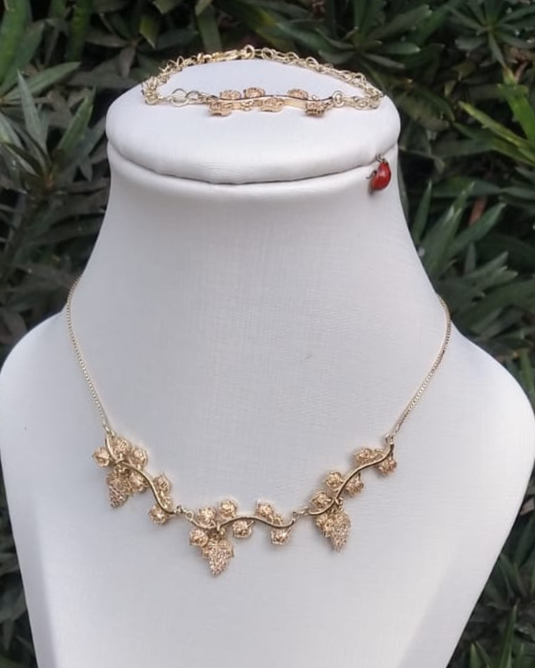 A gargantilha posiciona-se no pescoço, destacando o colo, com os pingentes de uvas pendendo delicadamente. Elas podem ser usadas sozinhas ou em conjuntos, muitas vezes vindo com brincos correspondentes.